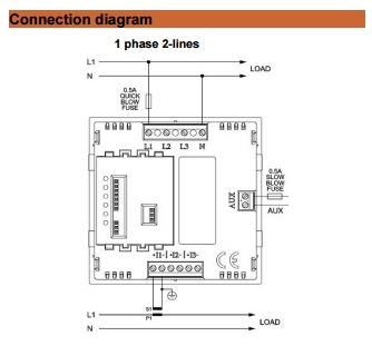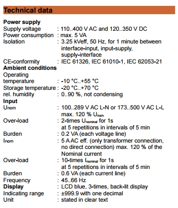 Measuring inputVoltage 100..500V AC, Current 0..5 A AC, via ext. current transformer |