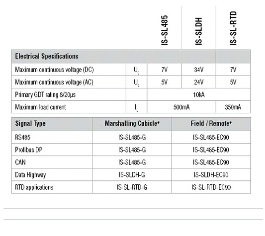 High-speed data applications are catered for with the IS-SL485 and IS-SLDH models feature operation up to 20MHz. The IS-SL485 is ideal for applications such as RS485 serial communication and protocols such as Profibus and CAN. Similarly IS-SLDH is designed for other high speed protocols such as Data Highway and Data Highway Plus. Typically, these models are used in conjunction with the EC90 base to provide isolation from earth