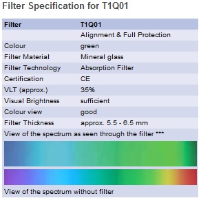 The laser safety filter Type T1Q01 is a green absorbing mineral glass filter without additional coating. The protection is based on absorption of the laser light within the bulk material. The LASERVISION filter Type T1Q01 has daylight transmission of approx. 35% but still a good colour recognition. The laser protection filter T1Q01 is available in four different frame styles and especially suitable for laser protection in the range between 690nm up to 1320nm and alignment protection at 633nm. Additionally the filter is certified with M-protection levels for ultra short pulse lasers at 720-1200nm. Please calculate required protection levels before using laser safety filters and compare with the filter provided.
